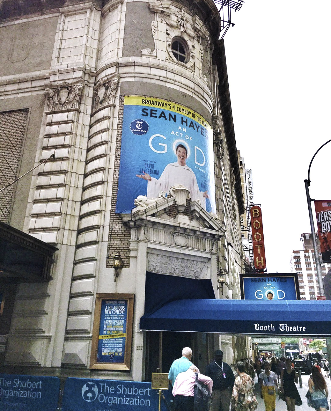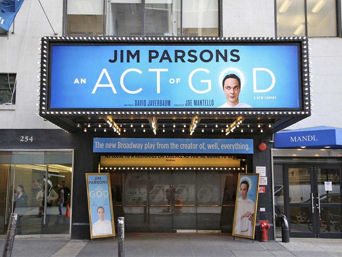 Theater signage for the 90-minute comedy written by multiple Emmy award-winning David Javerbaum. Pictured below is signage for different houses.