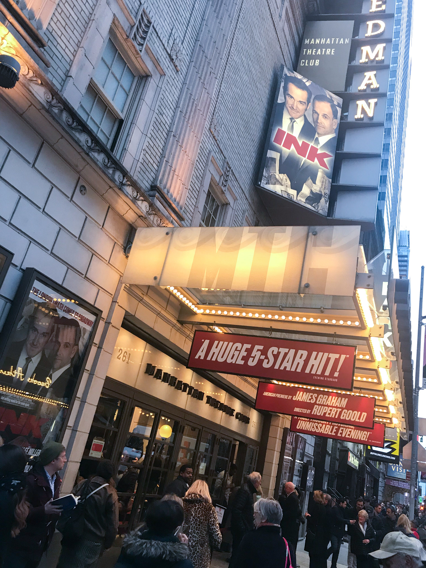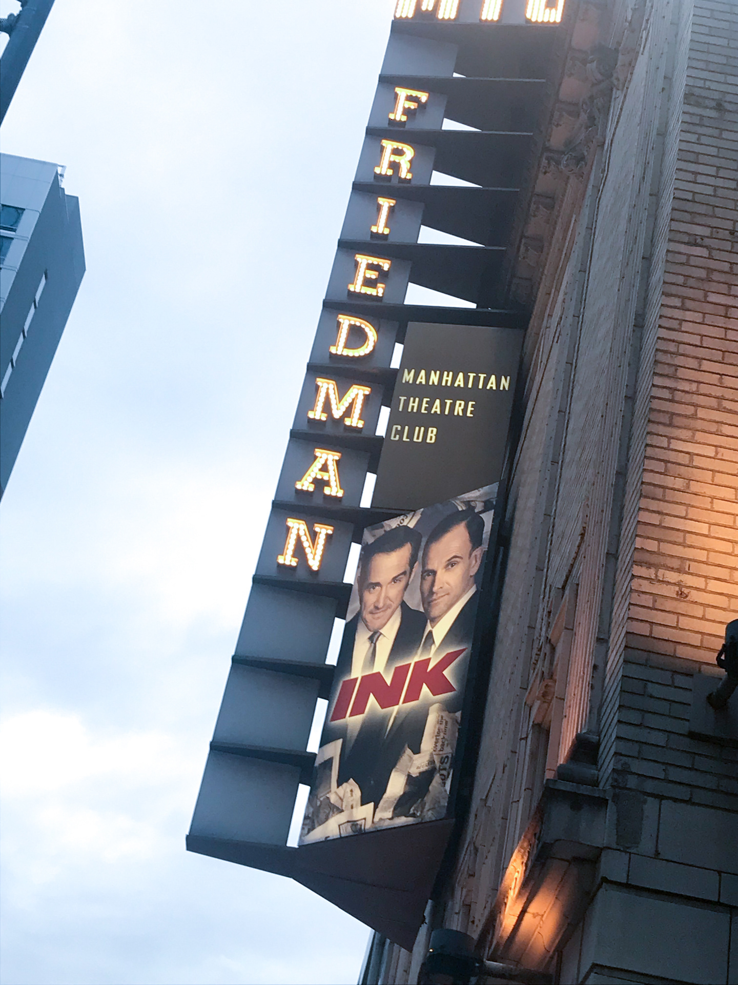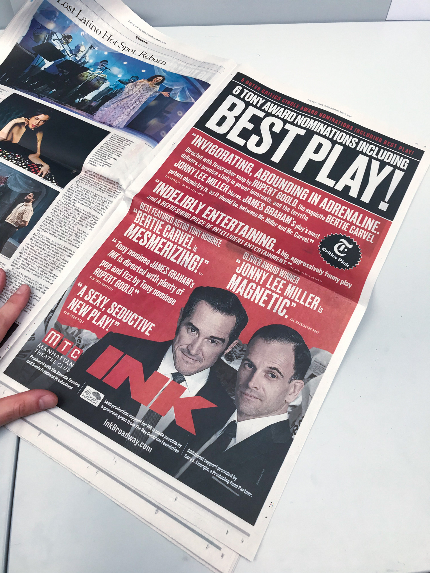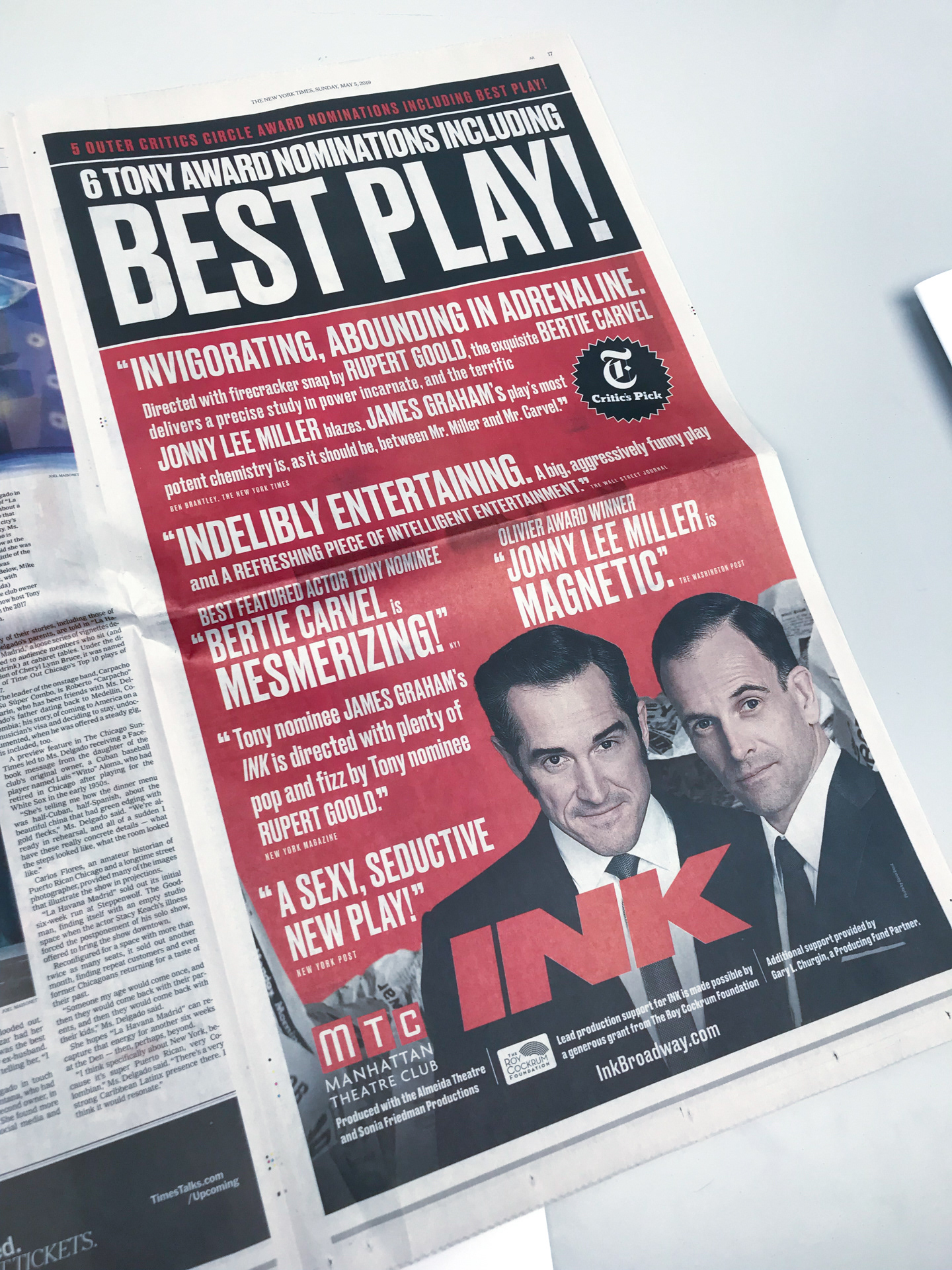 New York Times full page advertisement and theater signage for the MTC/Broadway production of a 2017 play by James Graham which premiered in London then transferred with Bertie Carvel and Jonny Lee Miller.